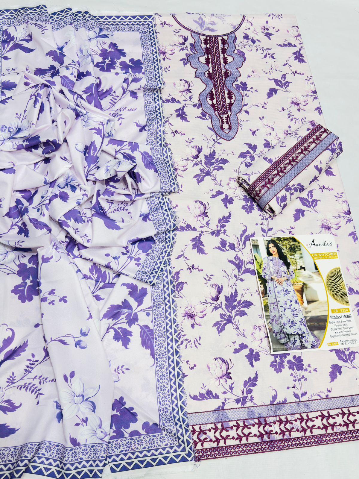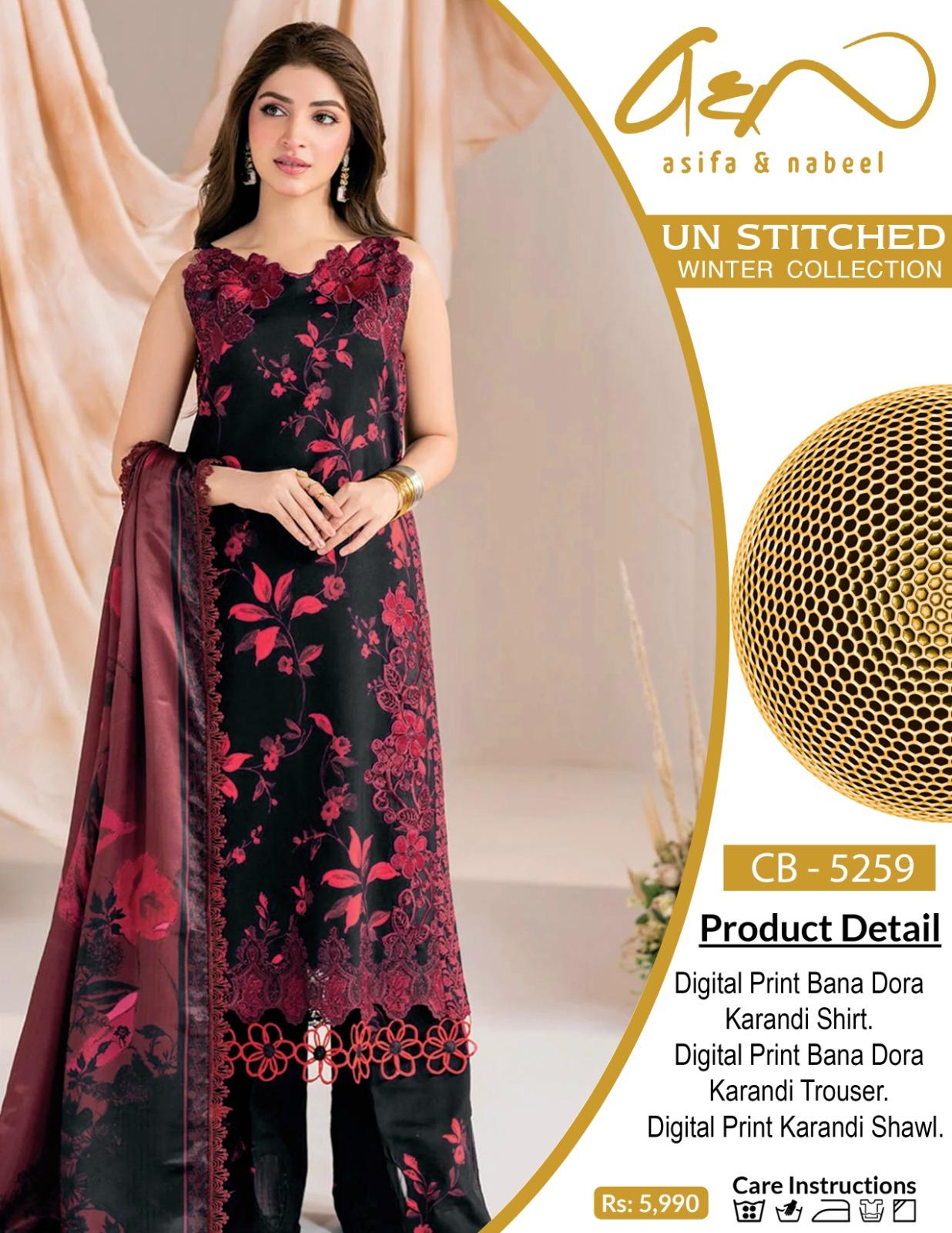 Experience timeless elegance with the Bana-Dora Karandi 3-Piece Embroidery Suite (Code CB 5259), a masterfully curated collection designed for the discerning individual. Constructed from 100% premium karandi fabric, this ensemble exemplifies superior quality and authentic craftsmanship. The collection comprises three meticulously coordinated pieces: a digitally printed karandi shirt featuring elaborate multi-head embroidered patches at the neckline and hemline, paired with a matching trouser adorned with sophisticated embroidery work. The ensemble is completed with a digitally printed karandi shawl that harmonizes seamlessly with the outfit. Each component showcases intricate detailing and refined artistry, making this suite an ideal choice for formal occasions, celebrations, and special events. The combination of digital printing and traditional embroidery techniques creates a distinctive aesthetic that balances contemporary design with cultural heritage. Perfect for those who appreciate quality fabrics and exquisite embellishment work.